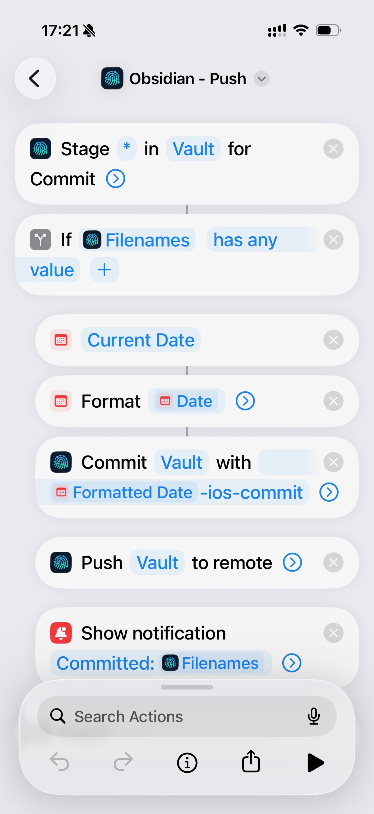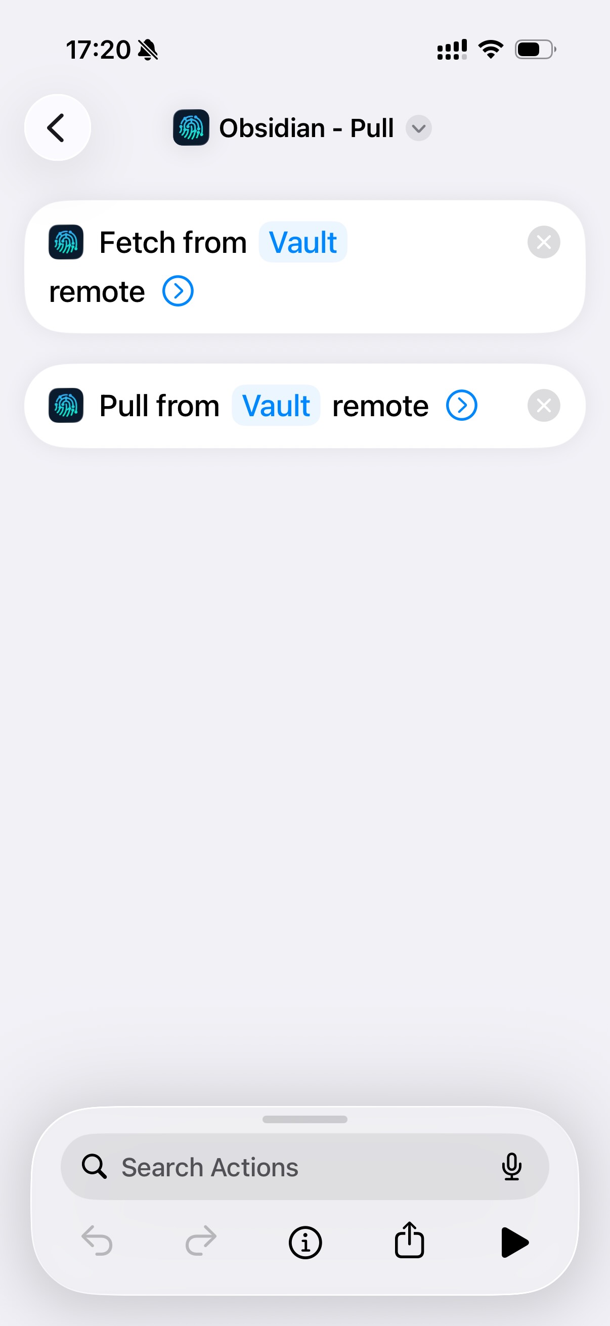 - Shortcuts Automations with app-open / app-close triggers. I set up two: pull when Obsidian opens, push when Obsidian closes. I also pinned a manual pull+push Shortcut to my home screen for when I want to force sync.