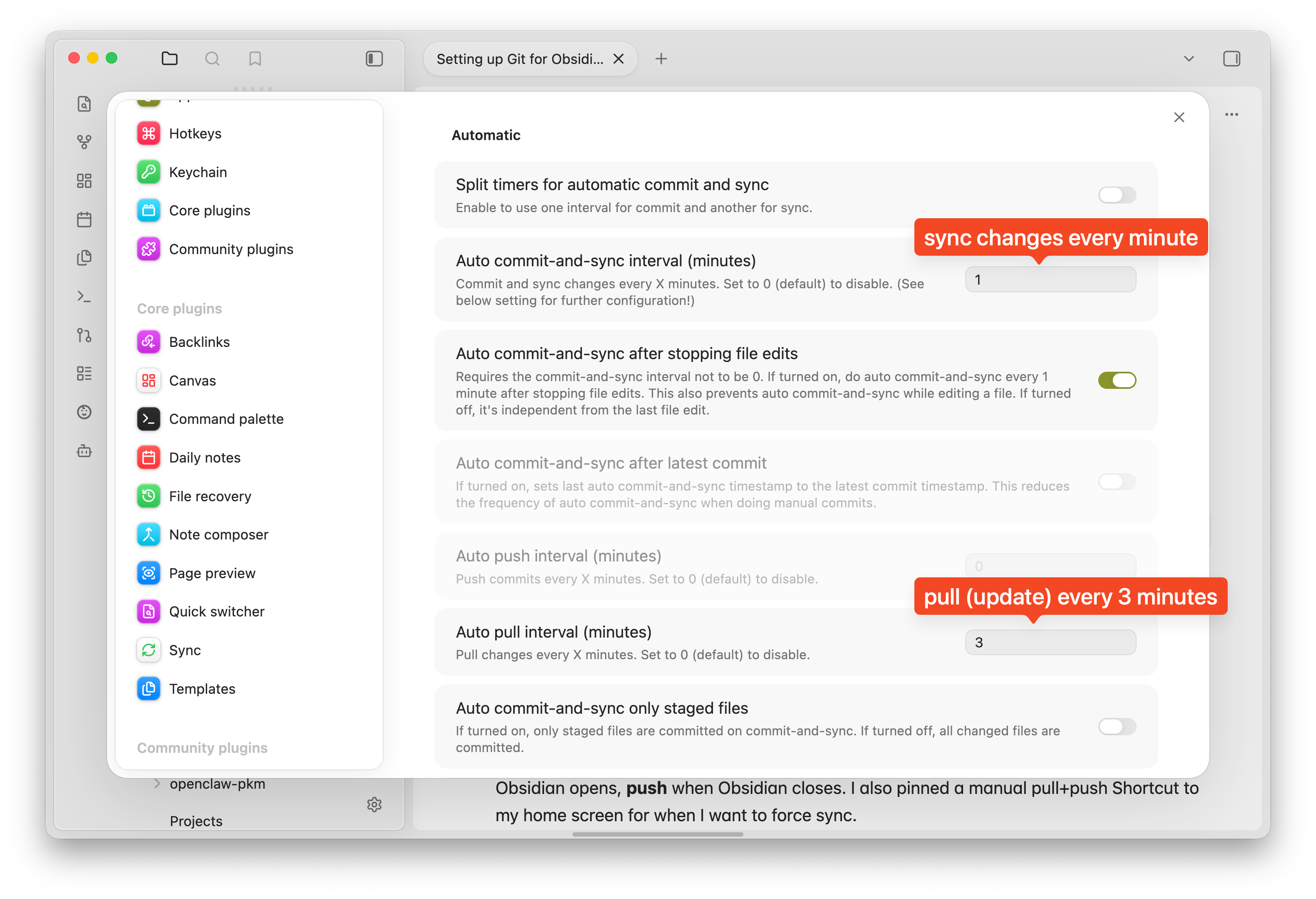 The obsidian-git plugin handles everything. Configure it to auto-pull on open and auto-commit + push every minute while editing. The messages are just timestamps (vault backup: 2026-04-21 13:56:46). It feels like iCloud, but underneath it’s git.