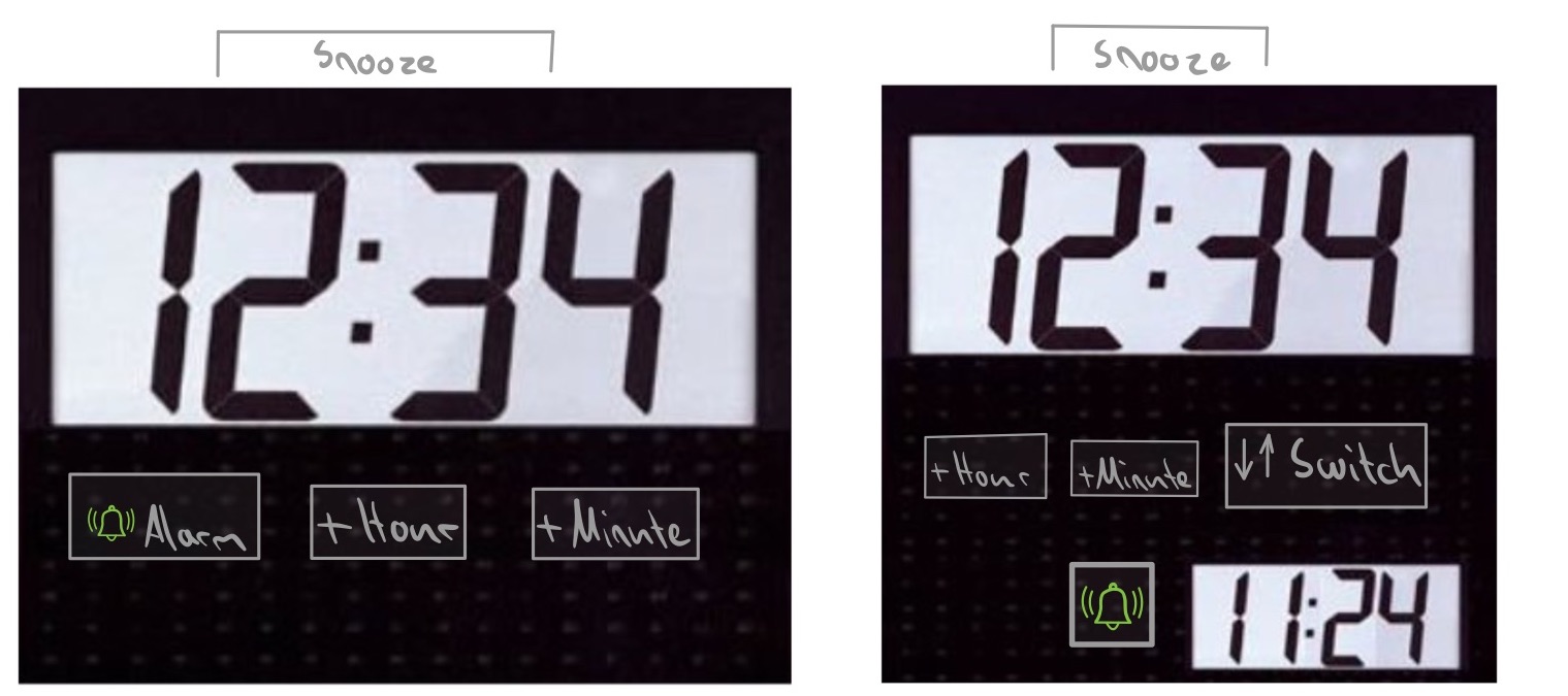 Both are similar in design, but the first design is simpler. That means its easier to understand and easier to manufacture (1 display only, less buttons). However, users can’t see the time the alarm is set for just by looking at the display. The second design also allows to have two different times which you can swap whenever you like. This function can be used independently from the alarm function.