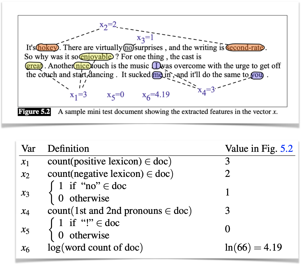 Z-Score (🚶 Logistic Regression) ==z=(∑i=1nwixi)+b== wi represents the weight (= importance) of a feature xi b is an extra bias 📖 Example: Sentiment classification Data Calculation Suppose wb=[2.5,−5.0,−1.2,0.5,2.0,0.7]=0.1 p(+∣x)=P(Y=1∣x)=σ(w⋅x+b)=σ([2.5,−5.0,−1.2,0.5,2.0,0.7]⋅[3,2,1,3,0,4.19]+0.1)=σ(.833)=0.70 🔗 Links 🚶 Logistic Regression