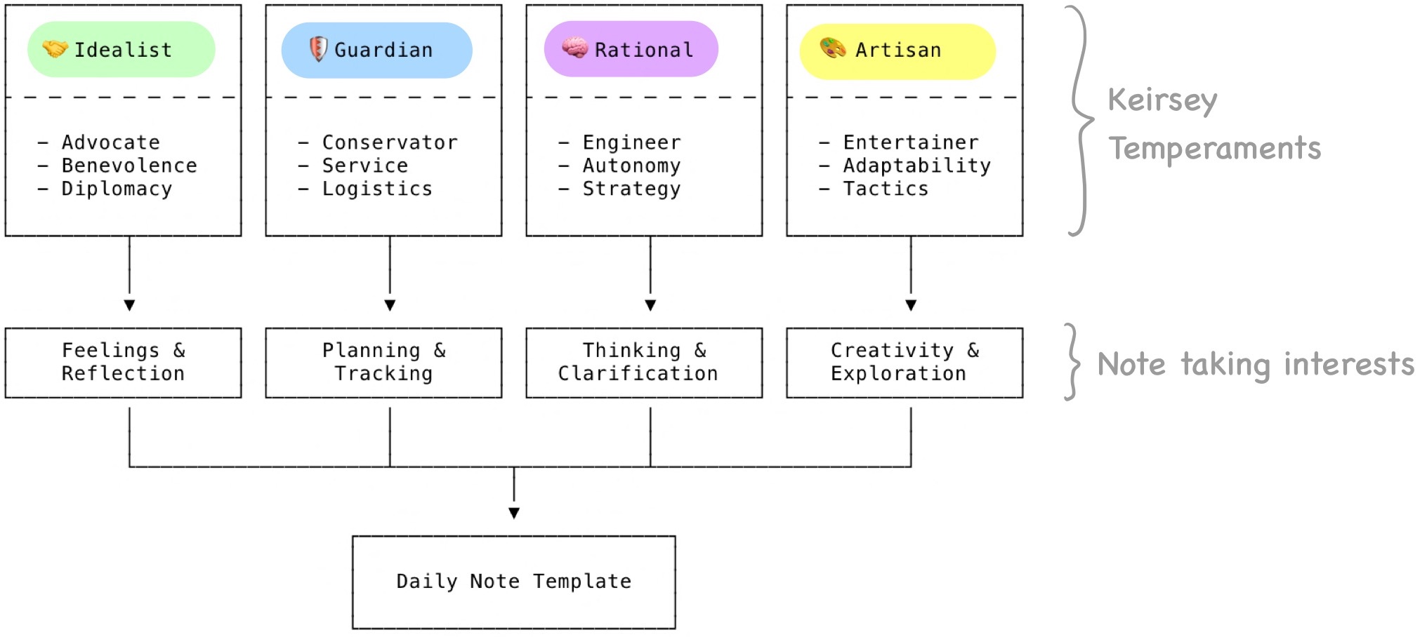 This template, in combination with the Alfred workflows, significantly improved my digital Daily Note-taking. The daily note-taking now helps me to discover new ideas as well as to clear up my thoughts. I value both of these benefits. If you wish to create your own personal Daily Note template, you can do a Keirsey Temperament Sorter test here. If you already know your MBTI15 personality type (e.g., if you did the 16Personalities test), you can check which temperament your personality type maps to using this infographic.