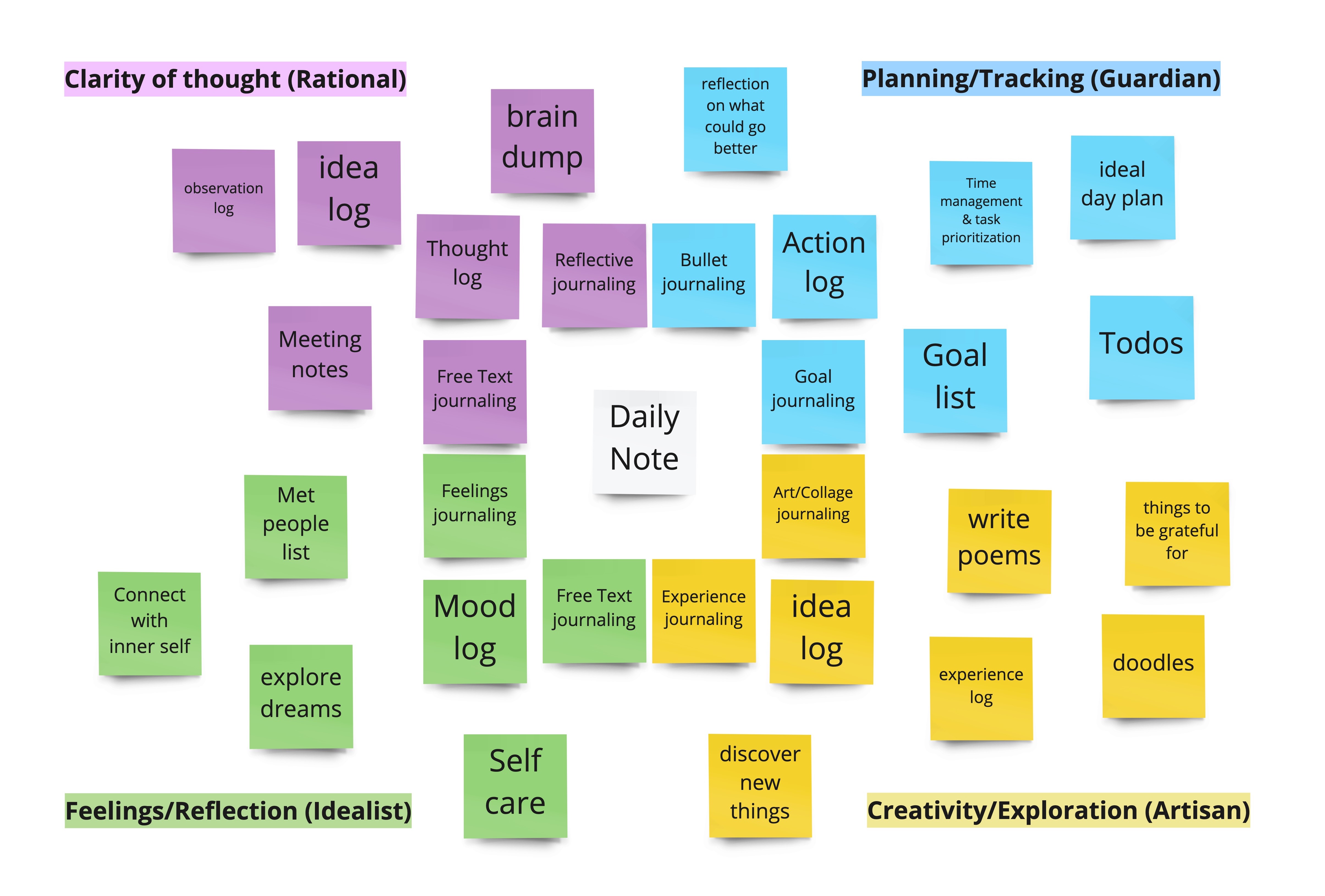 The Keirsey Temperament Sorter suggests four basic temperaments (i.e., personality type categories): Idealist, Guardian, Rational, Artisan. Taking these personality types as a baseline, one could now derive the following note-taking needs: