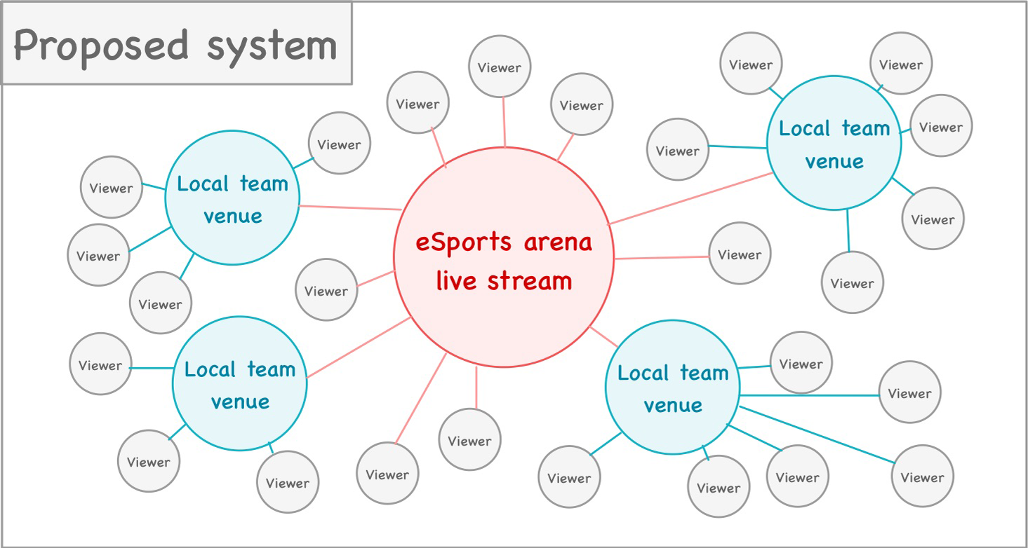 My suggestion for improving this status quo is to build team branded eSports venues, which serve as local hubs to view and play video games. You can think of it as a mix between cinema and internet cafe, owned and operated by an eSports organization or a licensed third party. Team venues would function as nodes, connecting the widespread fans at specific, team branded locations in the physical world.