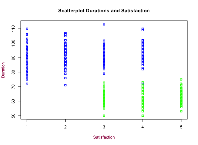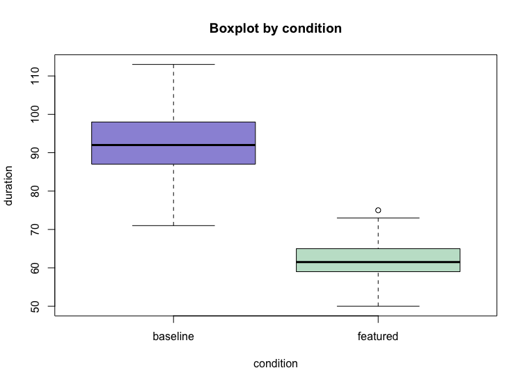 Man sieht klar, dass die Zufriedenheit bei der condition “baseline” um einiges niedriger ist. Außerdem ist die Duration sehr viel höher, vermutlich ist deshalb die Zufriedenheit auch niedriger. Bei condition “featured” ist die duration um einiges niedrieger, außerdem ist die Zufriedenheit viel höher. Condition “featured” scheint also in beiderlei Hinsicht besser zu sein.