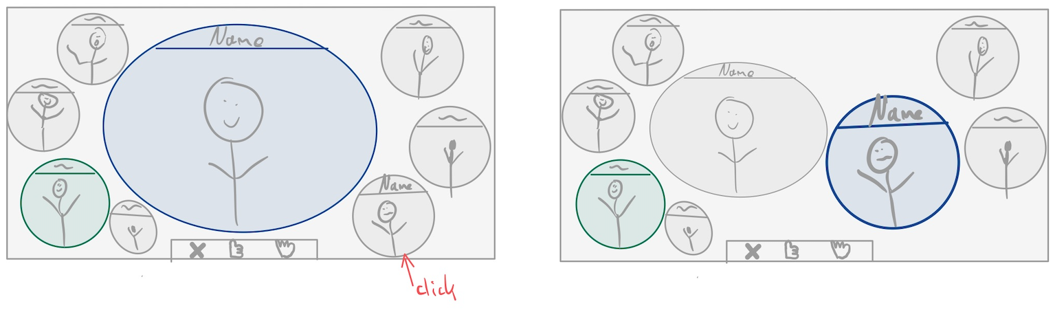 Clicking on a person (video feed) will highlight them and make the bubble bigger. The currently speaking person remains big and centered but the person you (you = green) clicked on gets more into focus.