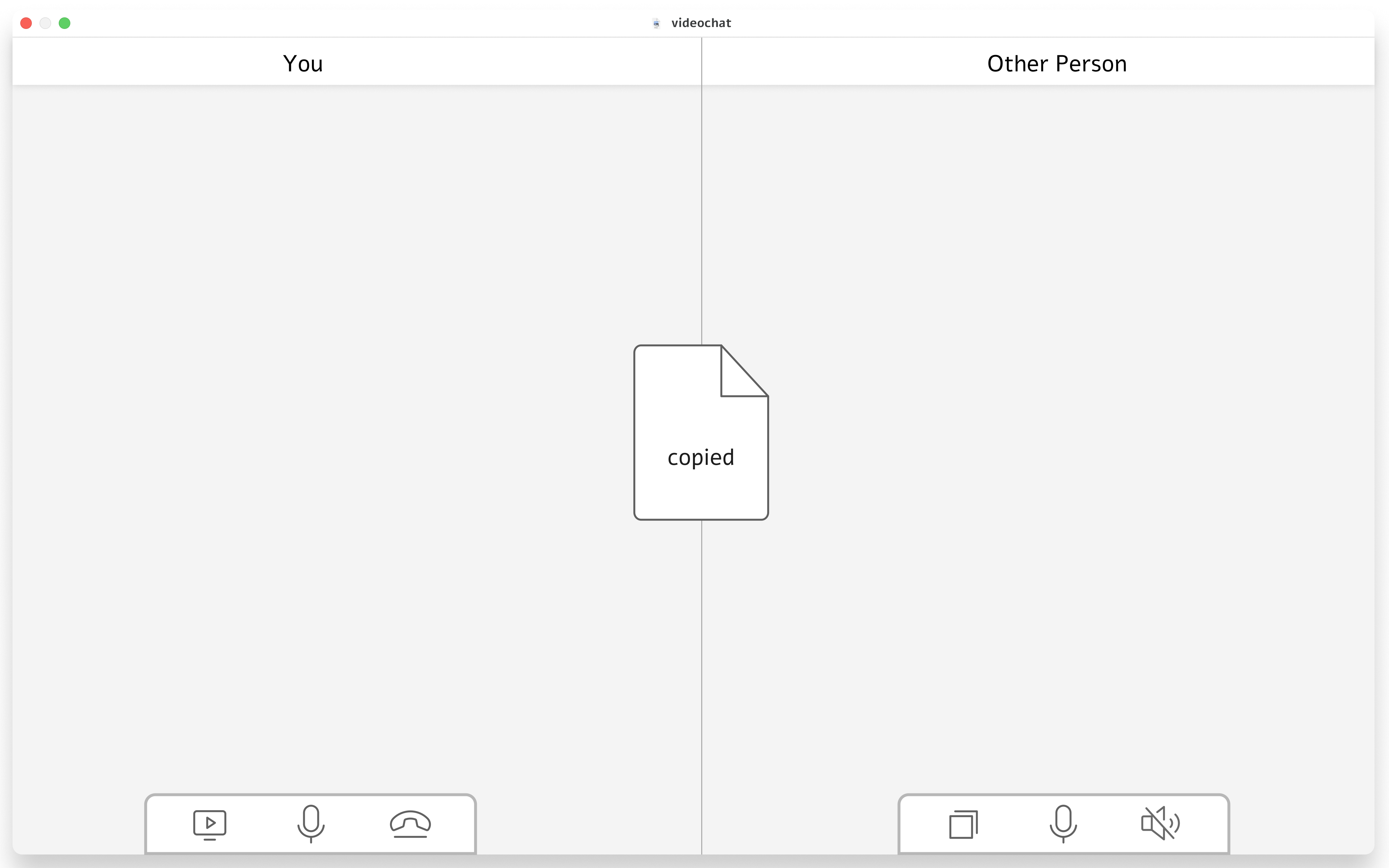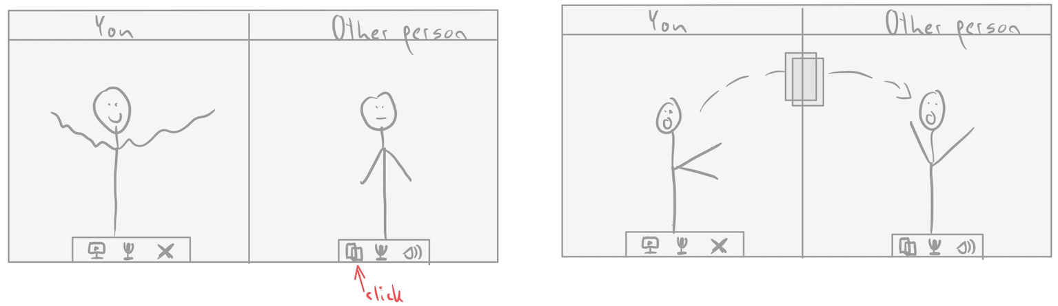Clicking on the copy button (or dragging a file on the video feed of the other person) will copy your current clipboard into the clipboard of the other person. Dragging a file onto the video feed will upload it to the cloud and then copy a link to the file into both participants clipboards. On completion an animation will be played showing the transfer.