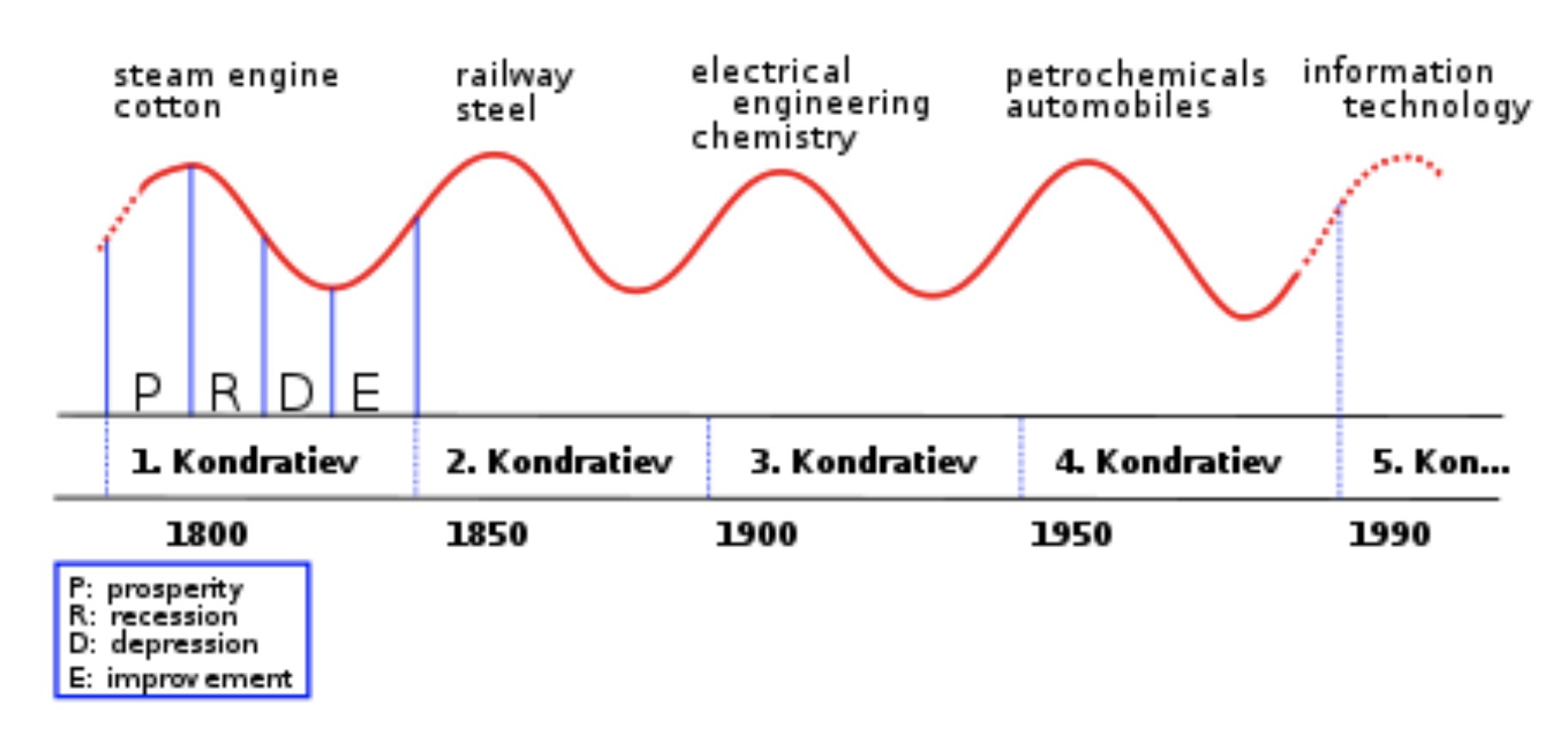 = a long term eceonomic cycle, believed to be born out of technological innovation, which results in a long term period of prosperity1