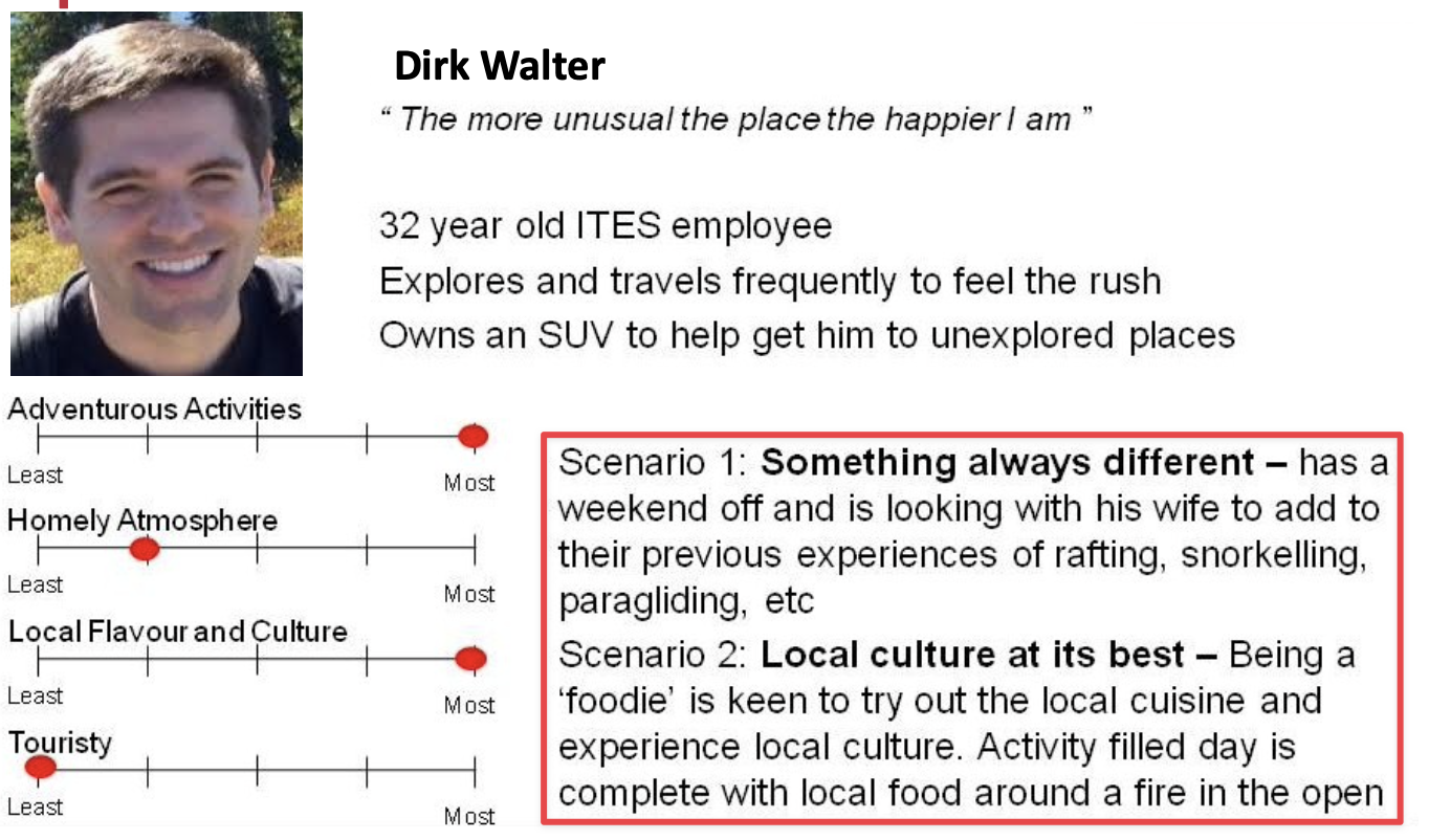 = fictitious stories about personas, which designers create to show how users might act to achieve a goal in a system or environment